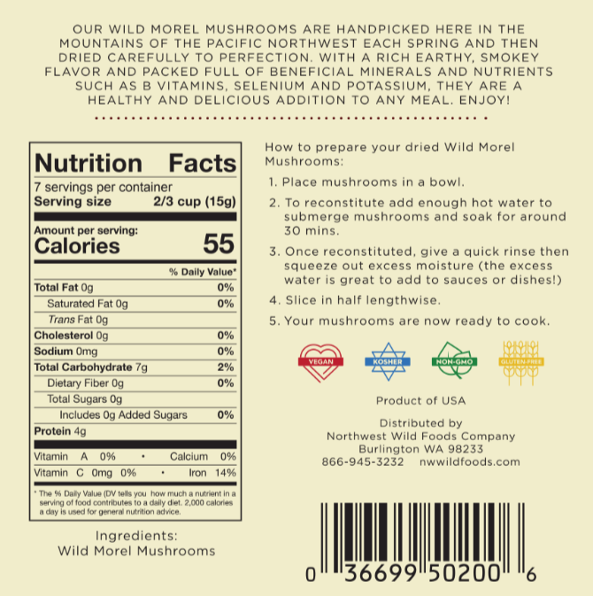 Our dried wild morel mushrooms are handpicked or forages right here in the mountains of the Pacific Northwest each spring and are then sun dried to perfection. Dried morel mushrooms have an amazing earthy, smoky flavor. They are an excellent substitute when fresh morels are not available. The wild morels actually gain flavor as they are sun dried to perfection. Bring them back to fresh quality life by soaking them in water or use them dried. Either way you will enjoy their delicious all natural flavor.