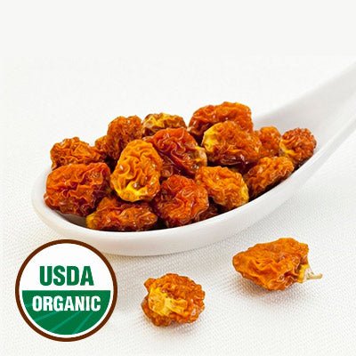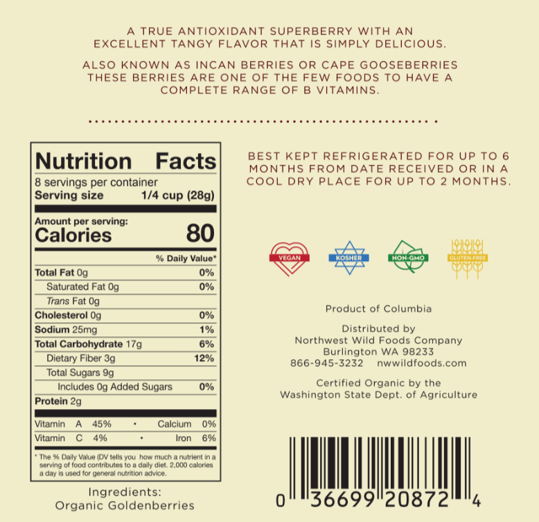 Dried organic goldenberries, also known as Incan berries or cape gooseberries are an antioxidant rich super berry with excellent tangy flavor that is simply delicious. Our organic dried goldenberries are high in vitamins, minerals, as well as antioxidants, and are a rare fruit form of Vitamin B12, protein, and phosphorus. Goldenberries have been prized for more than 1000 years as an incredible source of medicine and nutrition throughout South America. Native to Colombia, Peru and South Africa this exotic berry is treasured for its healing properties, and it is one of a few select crops that are grown at the ancient citadel, atop the mountain at Machu Pichu. The nutritional profile of our organic dried golden berries rivals many of the most popular super fruits, like the acai, goji, and schisandra berry. The mighty golden berry is one of the only fruits to have a wide range of B Vitamins, including B12, which vegans know is difficult to find in plant form. Goldenberries are a rare fruit source of protein, with a makeup of 16% pure protein, an amount higher than the coveted goji berry. Like all our dried fruit these berries are dried all naturally, no sugars or oils and are still raw.