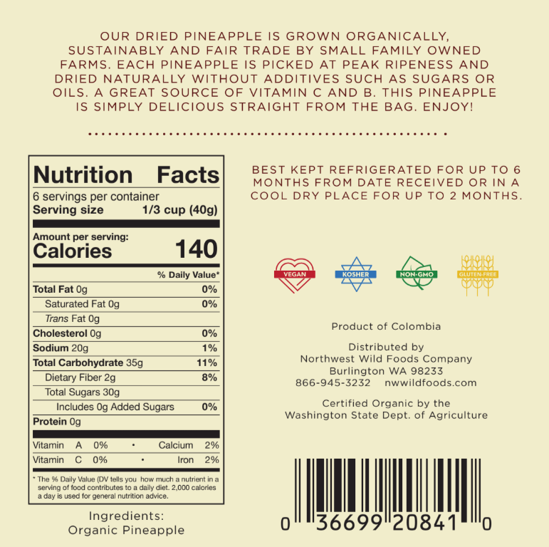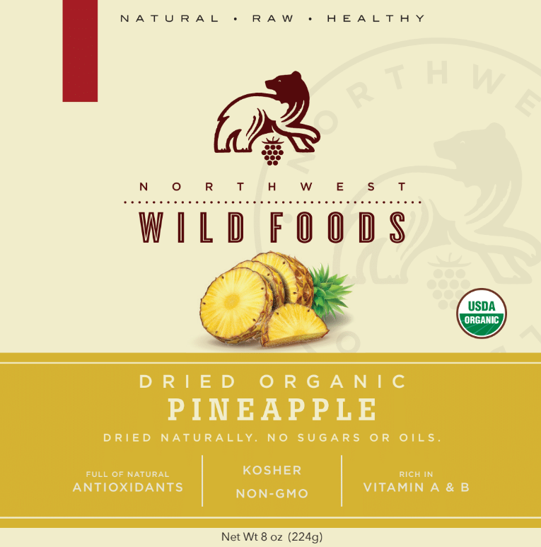 Our dried organic pineapple is made with sustainably and organically grown pineapples. There is no use of dangerous pesticide or chemical sprays that can seep into the fruit as well as the environment. Each fruit is ripened to perfection, then carefully hand gathered and naturally dried to lock in the full spectrum of health benefits. So you can enjoy our dried organic pineapple with a healthy body and a clear conscience! Pineapples have many beneficial health properties. They are an excellent source of vitamin C, manganese, copper, vitamin B1, vitamin B6, dietary fiber, folate, and pantothenic acid; which help aid with immune function, bone, hair and vision health just to name a few. In addition, they are also one of the only fruits which produce bromelain, this reduces mucus in your throat and nose and may help treat symptoms of the common cold and allergies. Many great reasons to try our dried organic pineapple today!