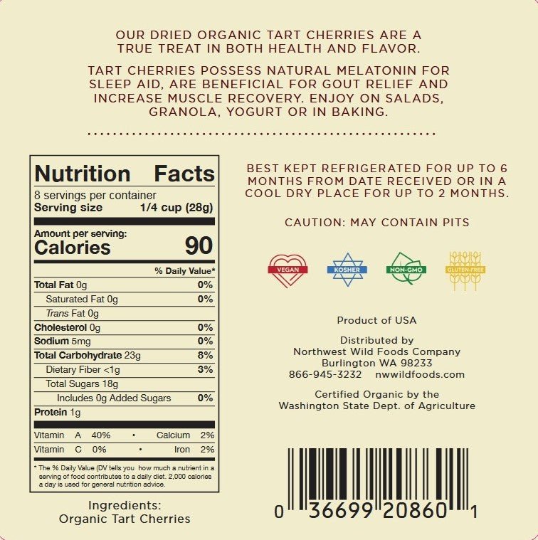 We’ve taken the finest Washington Montmorency tart cherries and dried them naturally without added sugars or oils (most other dried cherries on the market are processed with additives.) It takes six to eight pounds of tart cherries to make one pound of dried cherries. Enjoy them as a snack or toss into your favorite salad or dessert recipe. Dried organic tart cherries are naturally healthy and high in antioxidants for the body. Tart cherries contain anthocyanins which help promote joint health to help manage arthritis and gout. Super Oxide Dismutase (SOD) compounds help neutralize free radicals associated with diseases, protect artery walls from plaque build-up, and support heart function. Dried organic tart cherries contain antioxidants for your mind and melatonin for brain function and healthy sleep patterns. Research has also linked tart cherries to anti-inflammatory properties, reduced pain from gout and arthritis and an extensive list of heart health benefits. Recent studies even suggest tart cherries can help reduce post-exercise muscle and joint pain. Today, there are more than 50 studies specifically on tart cherries and scientists continue to uncover new and important benefits of one of today’s hottest super fruits.