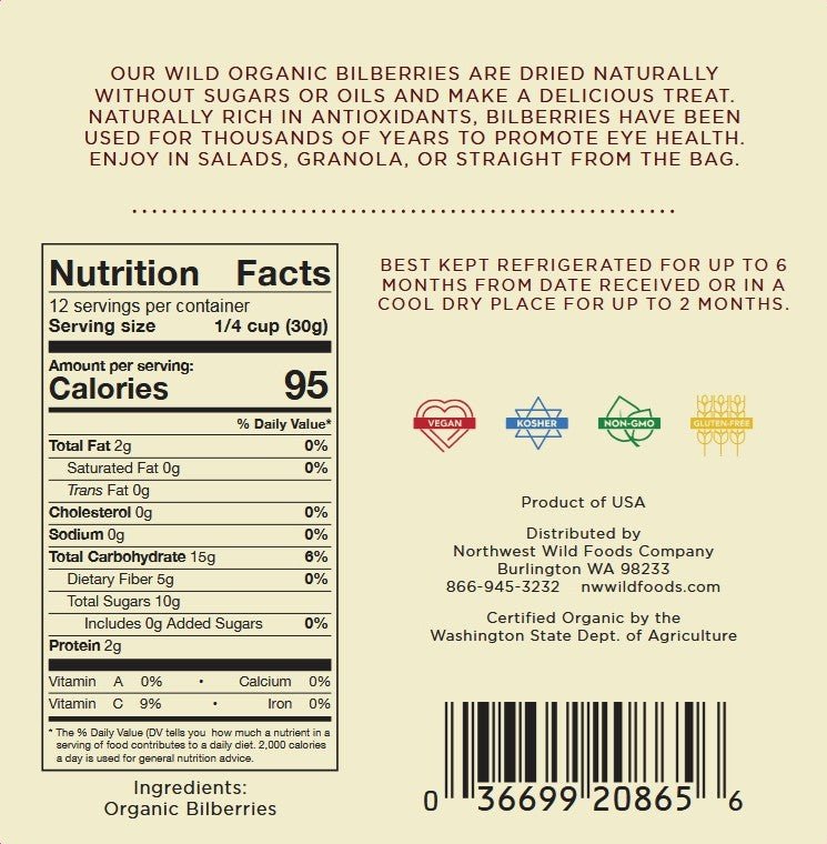 Our dried organic wild bilberries are carefully hand-picked each summer. Bilberries have been a staple ingredient in the European diet for centuries. They are consumed for their delicious flavor and health benefits. Bilberries are considered a natural medicine. Our bilberries are closely related to the American wild blueberry and wild huckleberry. They are extremely rich in antioxidants and have been shown beneficial in preventing many long term illnesses such as heart disease, cancer, and macular degeneration. A key compound in bilberries is their anthocyanins, which help build strong blood vessels and may help reduce blood clots. Dried bilberries are a versatile and healthy treat that can can be eaten straight out of the bag to get an energy boost for those busy days spent on the run. They also go well in baking and add a powerful antioxidant kick to your daily oatmeal, granola or yogurt. Whether you are eating our dried wild bilberries for their amazing flavor or their wonderful health benefits, we know you will enjoy these little gems. Shipped directly to you door. Enjoy!