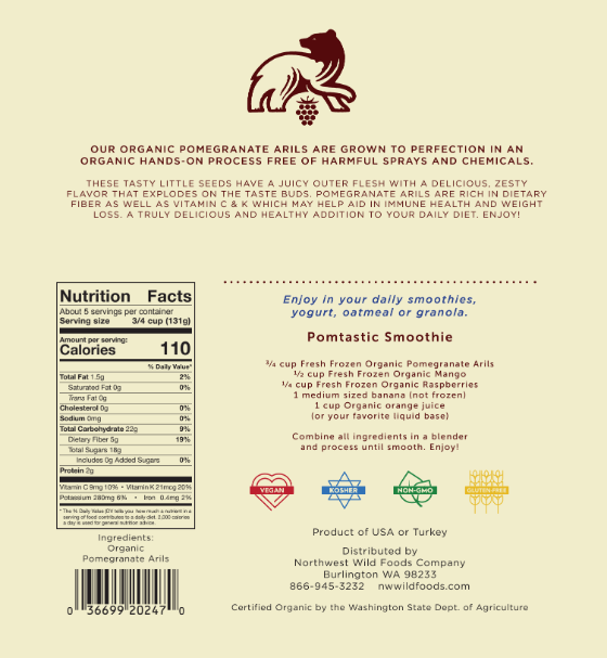 Our fresh frozen organic pomegranate arils are grown organically to perfection each winter. We have selected the finest pomegranates with the richest zesty flavor for your taste bud pleasure. Pomegranate arils are a delicious and healthy addition to smoothies, salads and many other dishes. These arils or seeds, are extremely rich in antioxidants especially vitamin C and pantothenic acid (B5). Preliminary studies show that eating pomegranate arils regularly may help prevent heart disease and cancer as well as aid in lowering cholesterol levels and fighting cell damage. Numerous Dr, and Dietitians have recommended eating pomegranate arils daily for healthy skin and many other benefits. Try our delicious organic pomegranate arils today.