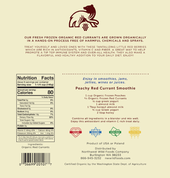 Red Currants are a beautiful red, tart berry that grows in grape-like clusters throughout Europe and parts of North America. Our organic red currants are grown organically and sustainable in Europe each summer, then hand picked and flash frozen on harvest day to lock in the maximum amount of nutrition and flavor. Traditionally red currants have been popular throughout Europe and often used in making jams, jellies, juices, wines, and compotes. Red currants are a very health berry containing extremely high amounts of vitamin C, which helps aid your immune system and over all health. Frozen red currants also make an excellent garnish on and can be used in delicious desserts. Shipped frozen straight to your door! Enjoy!