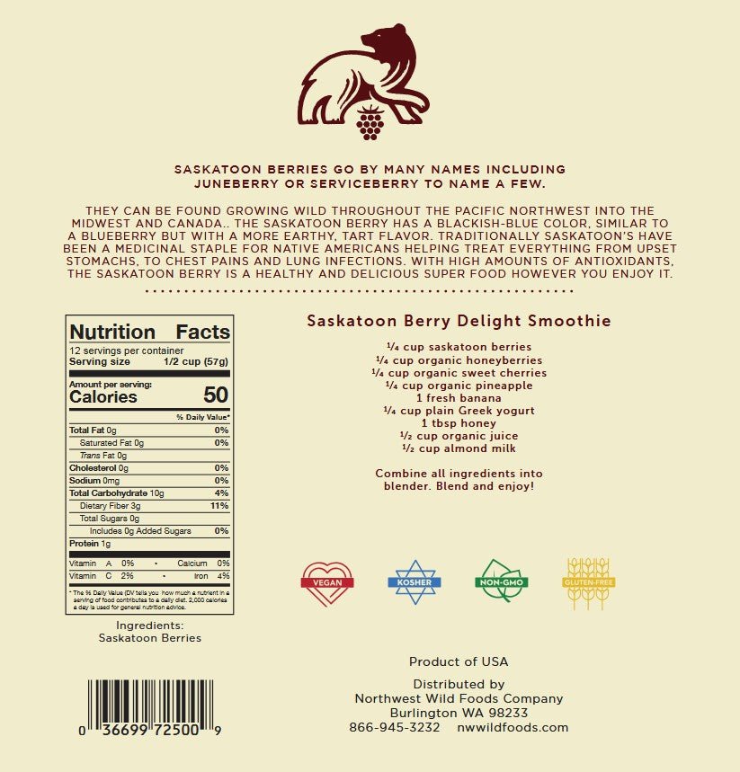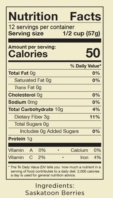 Traditionally Saskatoon’s have been a daily dietary as well as medicinal staple for Native American and First Nation peoples. Its uses included everything from helping treat upset stomachs, to chest pains and lung infections. Modern science has also recognized the true benefits of this tasty berry. With high amounts of antioxidants and nutrients, as well as protein and fiber, the Saskatoon Berry is a healthy and delicious super food. Our Fresh Frozen Saskatoon Berries are carefully hand picked, then same day flash frozen. This helps lock in flavor, aroma and essential nutrients. Shipped frozen straight to your door! Enjoy!