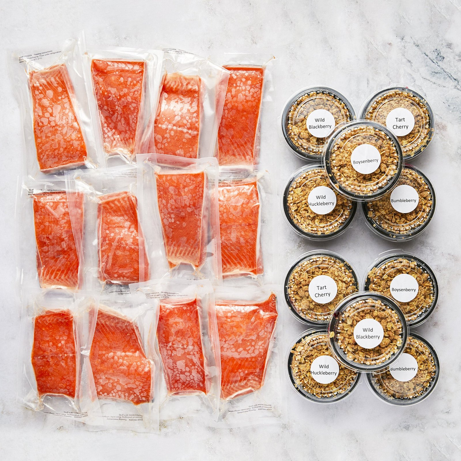 Each cobbler box includes 6 personal size mini cobblers. One of each flavor- Tart Cherry, Wild Huckleberry, Bumbleberry (organic red raspberries, organic blueberries and gourmet marionberries), Marionberry, Granny Smith Apple and Wild Blackberry.