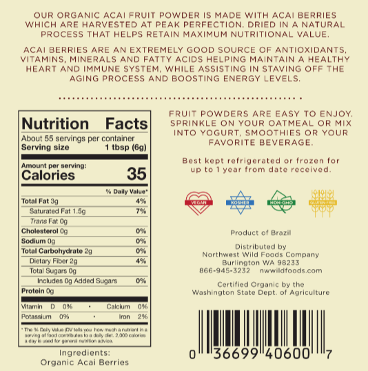 The acai berry is a small, mostly round, dark purple berry that grows in clusters on acai palms in the Amazon Jungle. Its flavor has been described as similar to a fruity red wine with a hint of chocolate. What makes this berry so popular throughout the world is the fact that it is brimming with antioxidants, essential fatty acids, vitamins, minerals, fiber and amino acids. These properties combined help promote healthy immune, nervous and cardiovascular systems, as well as muscle, heart and overall health. The tricky thing about obtaining these berries is that they only grow in the Amazon and are highly perishable and need to be consumed within a day. Some acai powders are processed via a ‘spray freeze’ method which involves heating the the berries to very high temperatures. This kills all the active properties in the berries, rendering them near, if not completely useless. Our Organic Acai powder is made from hand harvested berries which are “low impact” dried in a new process that is completely organic and natural, and helps retain the maximum nutritional health benefits of the berry. Try our new Organic Acai Powder today!