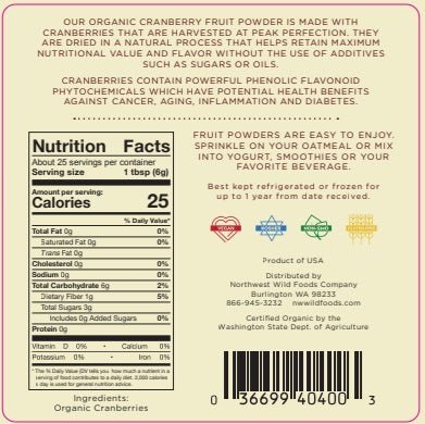 Our fruit is flash frozen on harvest day, which locks in the full nutritional benefits and antioxidant values of the fruit. The flash frozen fruit is then dried with a low impact method of dehydration in small batches that maintains low temperatures and maximum nutritional values of the fruit. Our powders maintain higher levels of antioxidants, polyphenols, flavor, color and a better taste than other powders. Not only are cranberries a tasty treat, traditionally popular in baking, but they have a plethora of health benefits as well. Consuming this low calorie berry is an excellent way to help treat urinary tract infections, as well as lower blood pressure, risks of cancers and boost immune functions. So rest easy! Not only are you doing the environment a favor, but your health and taste buds too! Enjoy our organic cranberry fruit powder today!