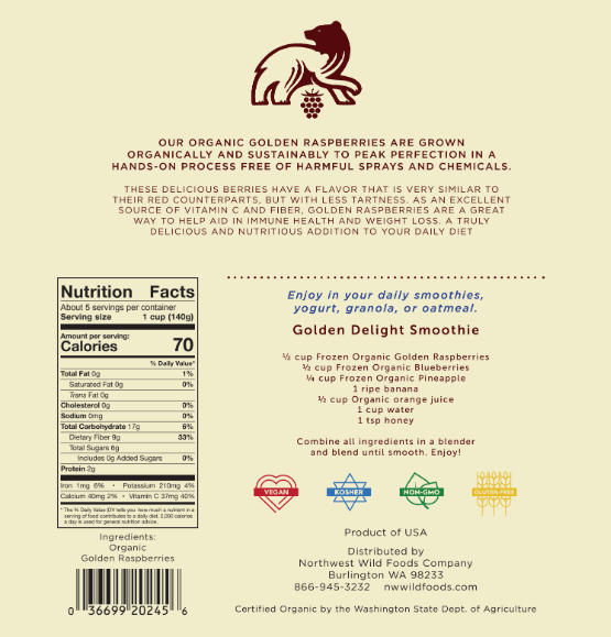 Our fresh frozen organic golden raspberries are grown organically in the mineral rich soils of Washington State. Each berry is hand-picked at ripe perfection then immediately flash frozen to lock in the the full flavor, aroma and nutritional value. This highly perishable fruit has a bright golden/orange color with pink-ish hues to it. Nutritionally the golden raspberry is very similar to the red raspberry, it’s in the flavor that you really start to notice the difference. Golden raspberries have more sweetness compared to their more popular counterparts the red raspberries. That doesn’t mean that they have a higher sugar content though, they just have less tartness to them naturally which allows the sweetness to shine through. An interesting thing about golden raspberries is that they carry rare recessive genes that have been around as long as raspberries have. These recessive genes mean that they lack the ability to produce color which in turn means that there is less natural tartness to them. This scrumptious berry is ideally used in the same applications as red raspberries such as in baking, jams, jellies and sorbets, with the exception of savory foods (due to the minimal acidity and higher sweetness). Not only do these gourmet berries have a great flavor that is highly sought after and hard to come by, but they are also an antioxidant rich treat that make a fantastic snack straight out of the bag. Shipped frozen to your door. Enjoy!