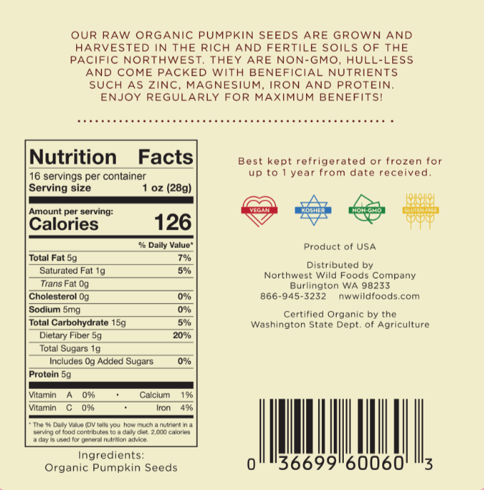 Our Raw Organic Pumpkin Seeds come out of the rich and fertile soils of the Pacific Northwest. They are Non GMO, hull-less and come brimming with beneficial nutrients such as zinc, magnesium, iron and protein. These pumpkin seeds are naturally hull-less which means that they naturally grow without the hull. Typically, they have less fiber as well as more protein and nutritional value compared to traditional pumpkin seeds. Raw organic pumpkin seeds are a delicious snack ready to eat straight out of the bag or also go well with salads, granola or baking. A truly tasty and versatile treat!