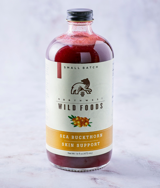 Sea Buckthorn Skin Support- Organic Strawberry juice, Organic Wild Blueberry juice, and Organic Sea Buckthorn juice.
